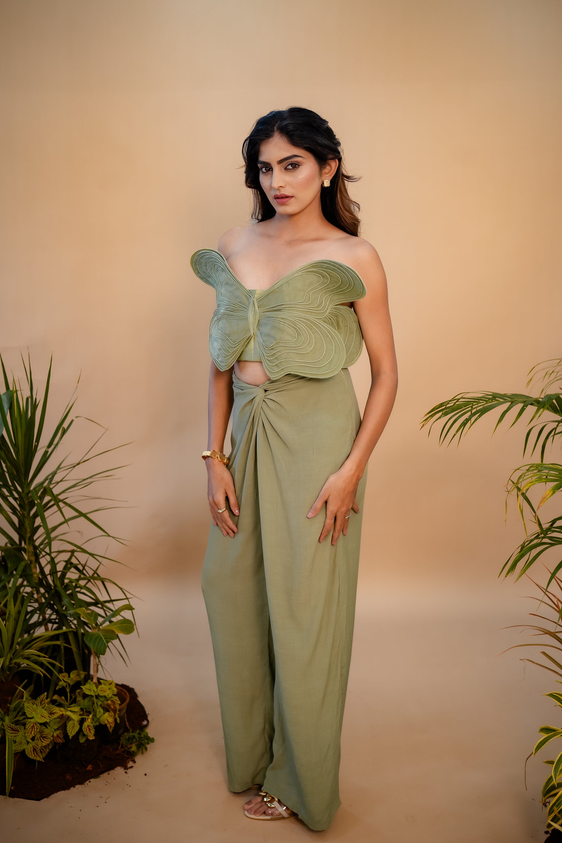 Fresh and playful, the pastel set is all about unique structure and comfort. A standout bustier top paired with high-waisted, relaxed drape pants, this look blends fashion-forward drama with wearability.