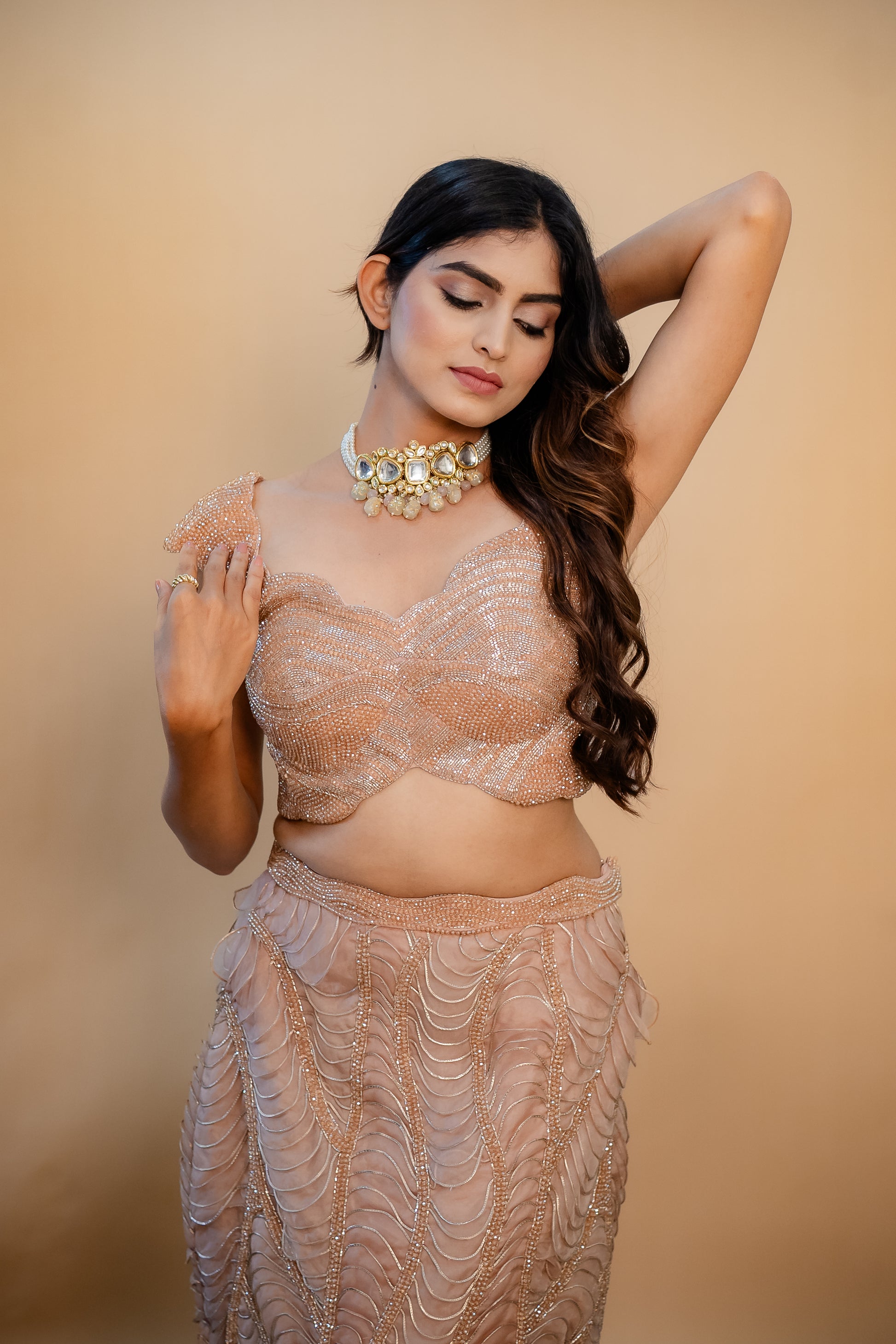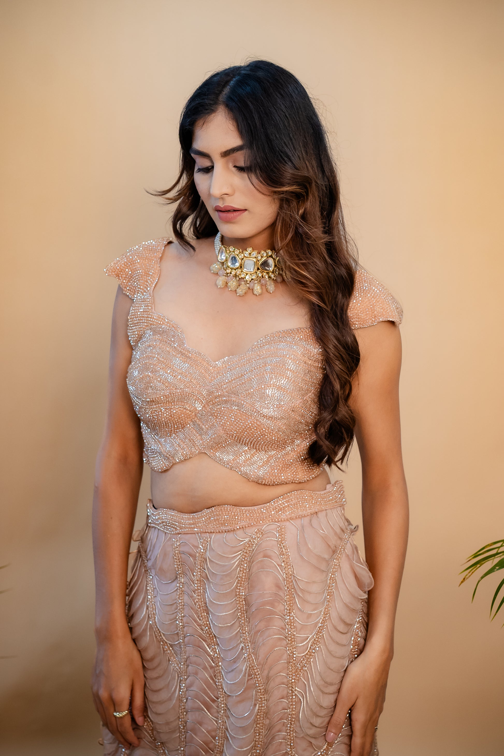 Drenched in crystals and Aeris textures, this one is one for the books. The blouse has cap sleeves, deep neck and an open back for that modern touch. Perfect for weddings as the bridesmaid or that one guest who stands out!