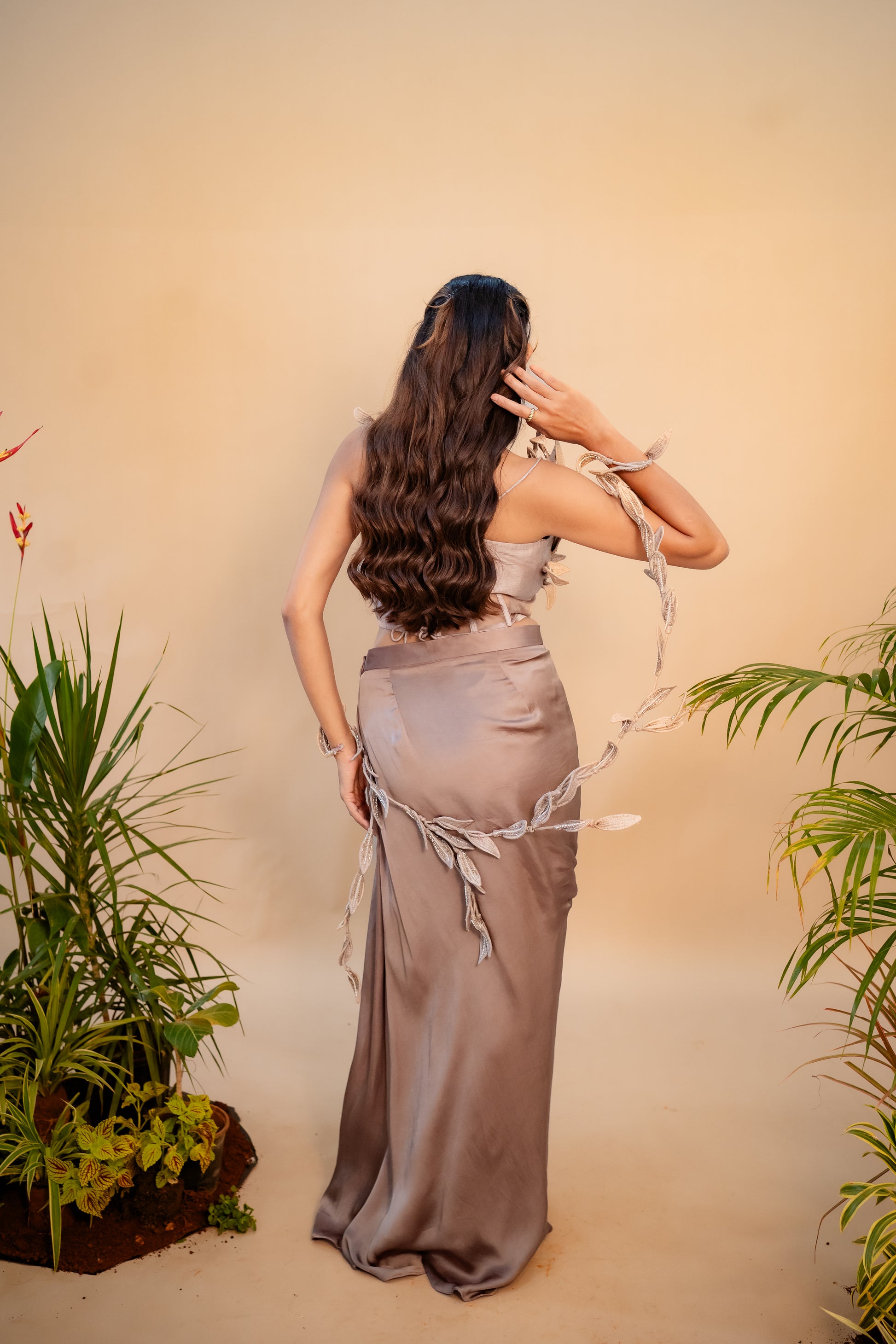 This look is straight up art in motion- a champagne corset decked out with embroidered leaves. And if you want it to be extra, put on those leaves for that fairy energy.