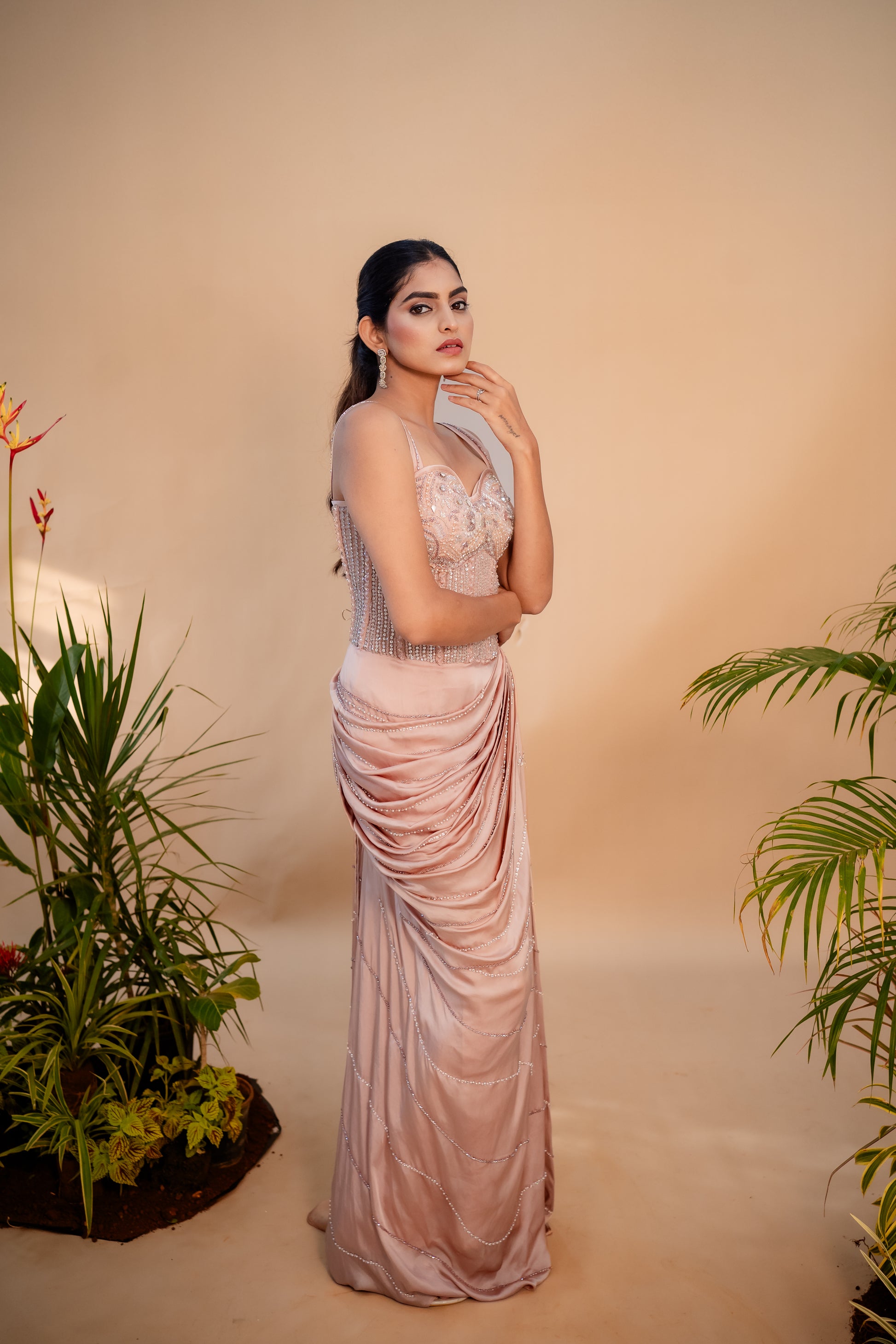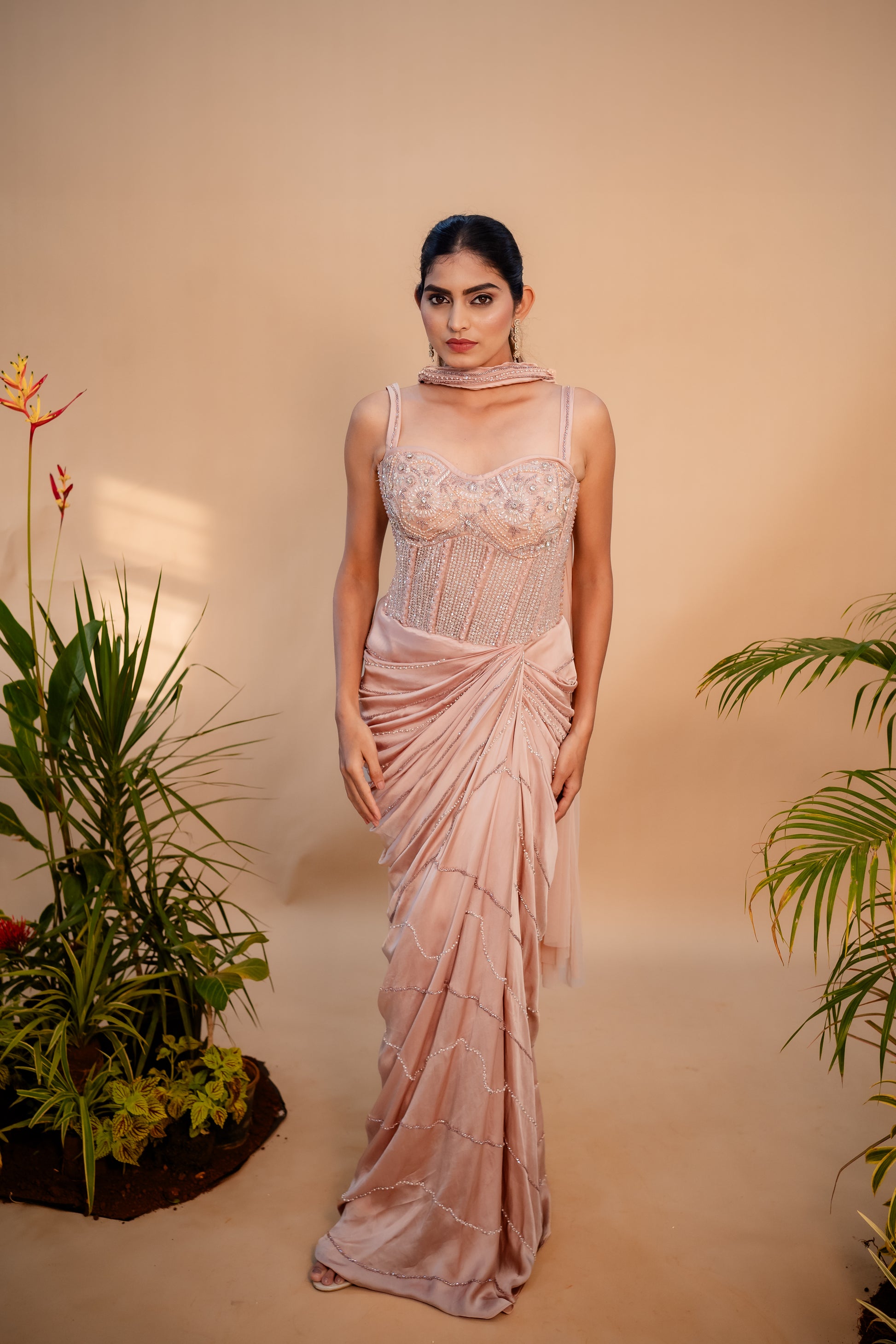 This nude pink gown is giving next level elegance- the top is covered in hand embroidery that's all about those rich details paired with soft pleated skirt. A look so chill and show stopping.