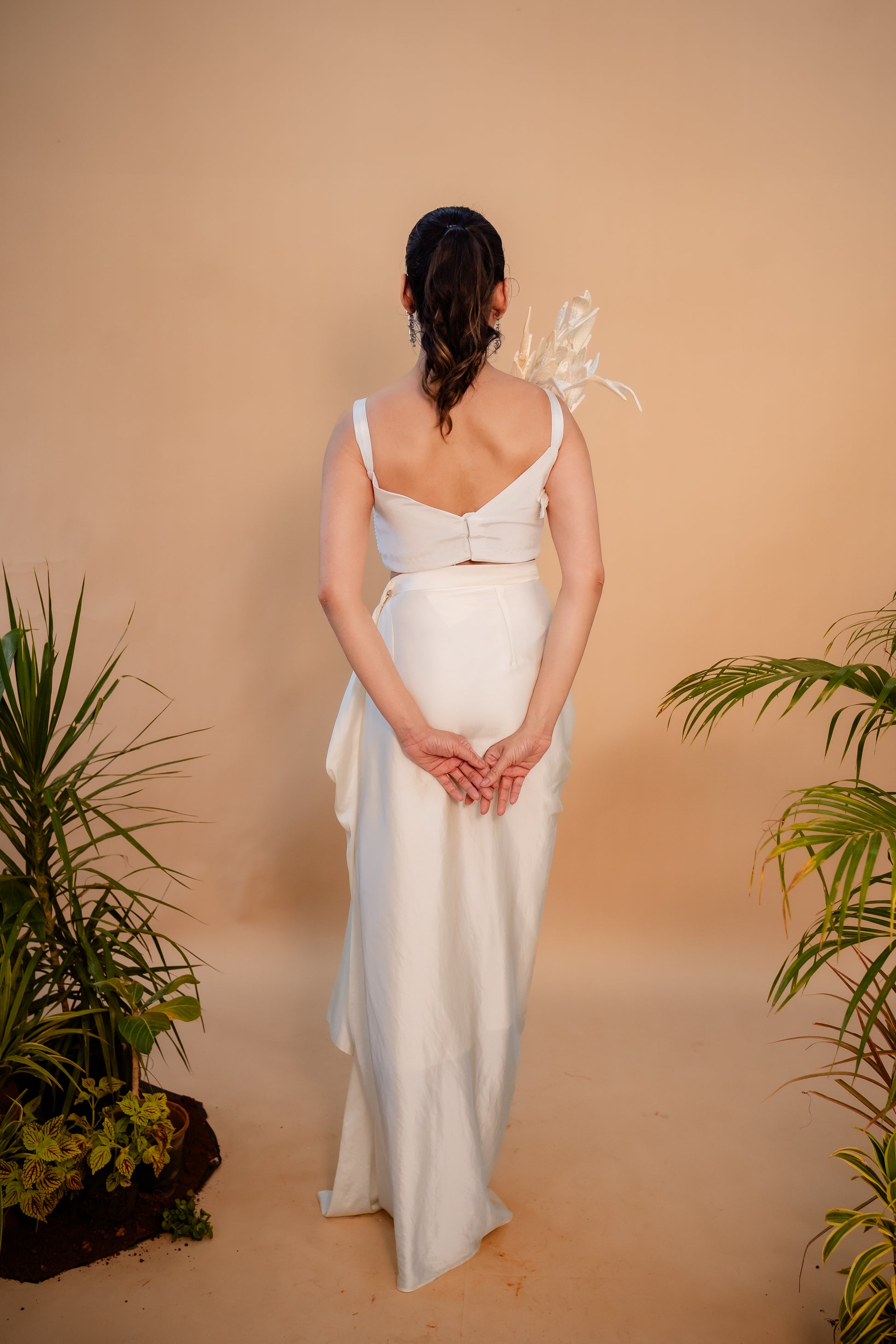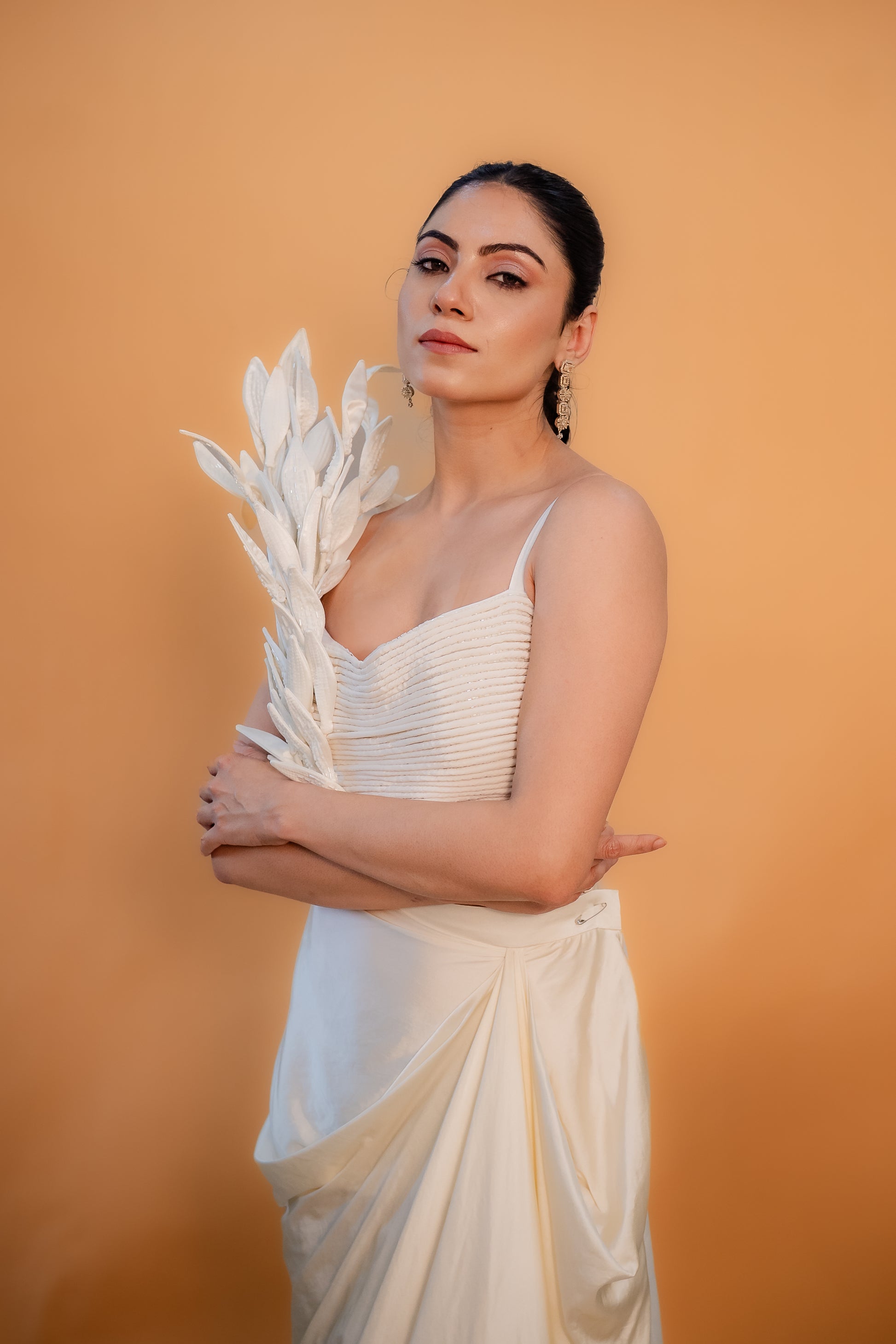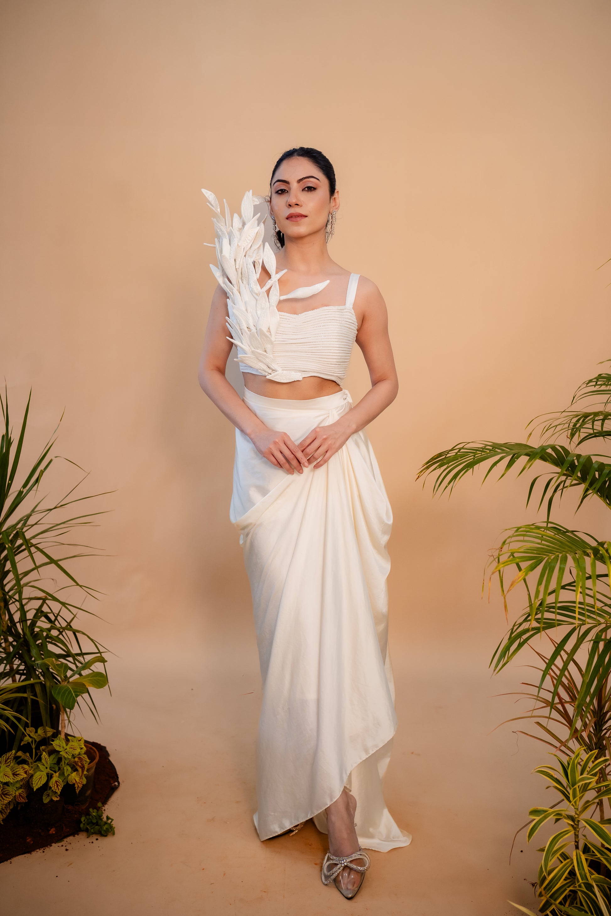 A total showstopper! 3D leafy vines climbing one side and those layered vibes all over. Paired with a breezy drape skirt to make you stand out wherever you go.